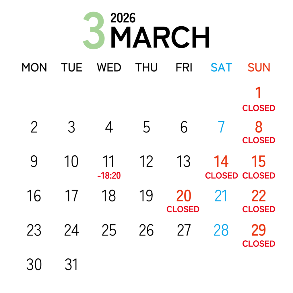 1(日)お休み8(日)お休み11(水)18:20閉店14(土)お休み15(日)お休み20(金・祝)お休み22(日)お休み29(日)お休み